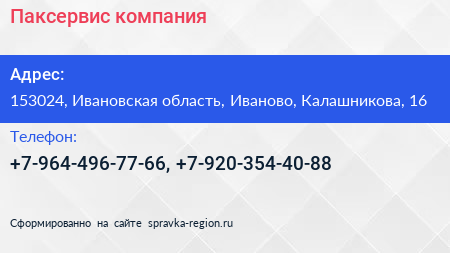 Паксервис, компания по адресу 153024, Ивановская область, Иваново, Калашникова, 16 в дальнейшем Организация, размещена в следующих категориях: