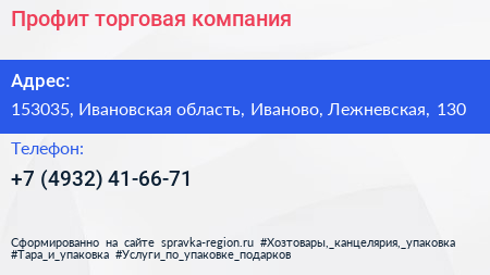 Профит, торговая компания по адресу 153035, Ивановская область, Иваново, Лежневская, 130 в дальнейшем Организация, размещена в следующих категориях: