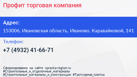 Профит, торговая компания по адресу 153006, Ивановская область, Иваново, Каравайковой, 141 в дальнейшем Организация, размещена в следующих категориях: