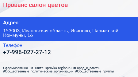 Прованс, салон цветов по адресу 153003, Ивановская область, Иваново, Парижской Коммуны, 16 в дальнейшем Организация, размещена в следующих категориях: