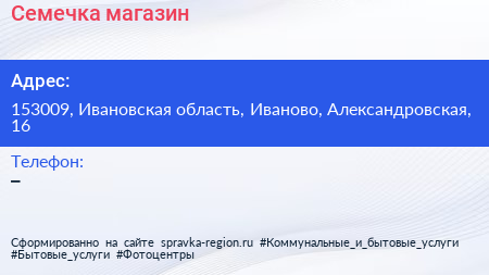Семечка, магазин по адресу 153009, Ивановская область, Иваново, Александровская, 16 в дальнейшем Организация, размещена в следующих категориях: