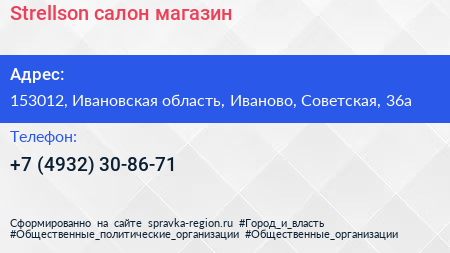 Strellson, салон-магазин по адресу 153012, Ивановская область, Иваново, Советская, 36а в дальнейшем Организация, размещена в следующих категориях: