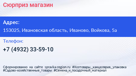 Сюрприз, магазин по адресу 153025, Ивановская область, Иваново, Войкова, 5а в дальнейшем Организация, размещена в следующих категориях: