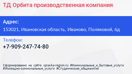 ТД Орбита, производственная компания по адресу 153021, Ивановская область, Иваново, Поляковой, 6д в дальнейшем Организация, размещена в следующих категориях: