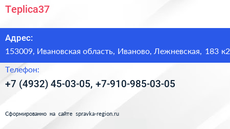 Teplica37 по адресу 153009, Ивановская область, Иваново, Лежневская, 183 к2 в дальнейшем Организация, размещена в следующих категориях: