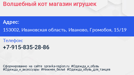 Волшебный кот, магазин игрушек по адресу 153002, Ивановская область, Иваново, Громобоя, 15/19 в дальнейшем Организация, размещена в следующих категориях: