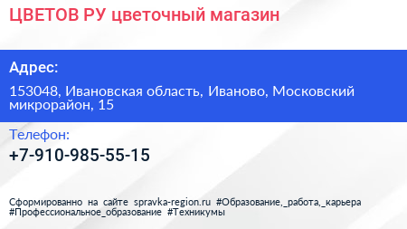 ЦВЕТОВ.РУ, цветочный магазин по адресу 153048, Ивановская область, Иваново, Московский микрорайон, 15 в дальнейшем Организация, размещена в следующих категориях: