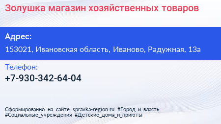 Золушка, магазин хозяйственных товаров по адресу 153021, Ивановская область, Иваново, Радужная, 13а в дальнейшем Организация, размещена в следующих категориях: