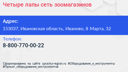 Четыре лапы, сеть зоомагазинов по адресу 153037, Ивановская область, Иваново, 8 Марта, 32 в дальнейшем Организация, размещена в следующих категориях: