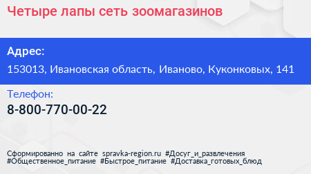 Четыре лапы, сеть зоомагазинов по адресу 153013, Ивановская область, Иваново, Куконковых, 141 в дальнейшем Организация, размещена в следующих категориях: