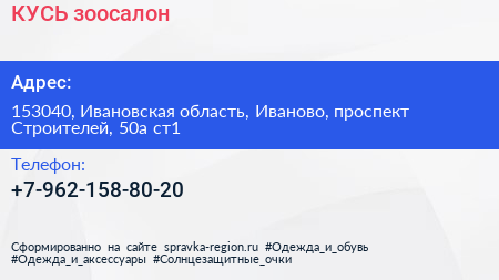 КУСЬ, зоосалон по адресу 153040, Ивановская область, Иваново, проспект Строителей, 50а ст1 в дальнейшем Организация, размещена в следующих категориях: