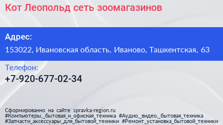 Кот Леопольд, сеть зоомагазинов по адресу 153022, Ивановская область, Иваново, Ташкентская, 63 в дальнейшем Организация, размещена в следующих категориях: