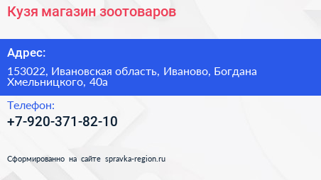 Кузя, магазин зоотоваров по адресу 153022, Ивановская область, Иваново, Богдана Хмельницкого, 40а в дальнейшем Организация, размещена в следующих категориях: