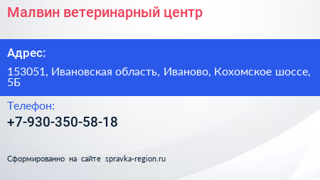 Малвин, ветеринарный центр по адресу 153051, Ивановская область, Иваново, Кохомское шоссе, 5Б в дальнейшем Организация, размещена в следующих категориях:
