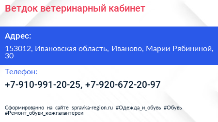 Ветдок, ветеринарный кабинет по адресу 153012, Ивановская область, Иваново, Марии Рябининой, 30 в дальнейшем Организация, размещена в следующих категориях: