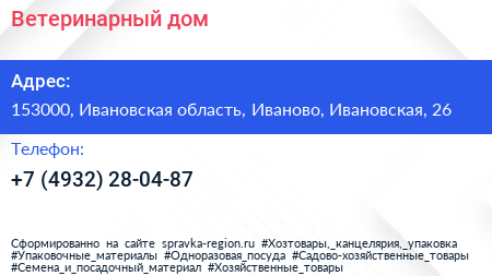 Ветеринарный дом по адресу 153000, Ивановская область, Иваново, Ивановская, 26 в дальнейшем Организация, размещена в следующих категориях: