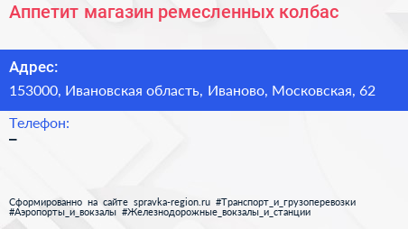 Аппетит, магазин ремесленных колбас по адресу 153000, Ивановская область, Иваново, Московская, 62 в дальнейшем Организация, размещена в следующих категориях: