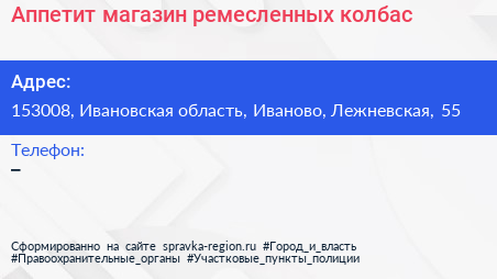 Аппетит, магазин ремесленных колбас по адресу 153008, Ивановская область, Иваново, Лежневская, 55 в дальнейшем Организация, размещена в следующих категориях: