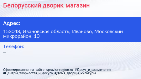 Белорусский дворик, магазин по адресу 153048, Ивановская область, Иваново, Московский микрорайон, 10 в дальнейшем Организация, размещена в следующих категориях: