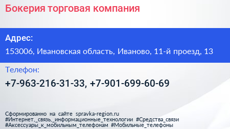 Бокерия, торговая компания по адресу 153006, Ивановская область, Иваново, 11-й проезд, 13 в дальнейшем Организация, размещена в следующих категориях: