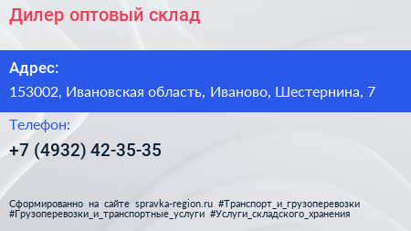 Дилер, оптовый склад по адресу 153002, Ивановская область, Иваново, Шестернина, 7 в дальнейшем Организация, размещена в следующих категориях: