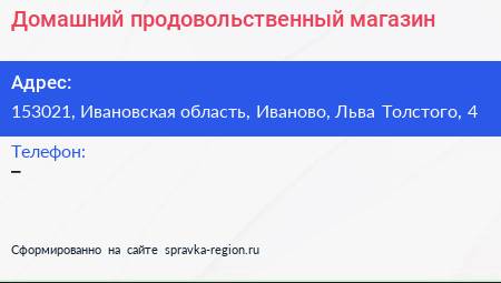 Домашний, продовольственный магазин по адресу 153021, Ивановская область, Иваново, Льва Толстого, 4 в дальнейшем Организация, размещена в следующих категориях: