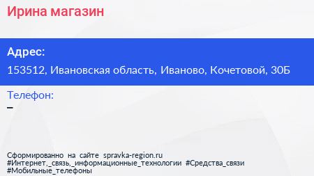 Ирина, магазин по адресу 153512, Ивановская область, Иваново, Кочетовой, 30Б в дальнейшем Организация, размещена в следующих категориях: