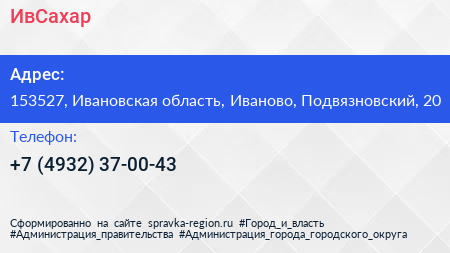 ИвСахар по адресу 153527, Ивановская область, Иваново, Подвязновский, 20 в дальнейшем Организация, размещена в следующих категориях: