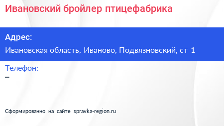 Ивановский бройлер, птицефабрика по адресу Ивановская область, Иваново, Подвязновский, ст 1 в дальнейшем Организация, размещена в следующих категориях: