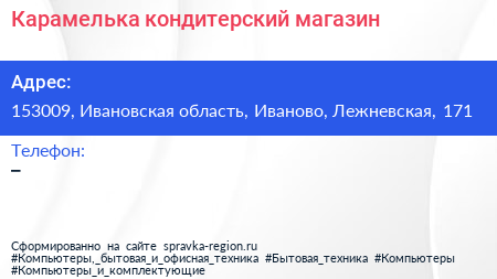 Карамелька, кондитерский магазин по адресу 153009, Ивановская область, Иваново, Лежневская, 171 в дальнейшем Организация, размещена в следующих категориях: