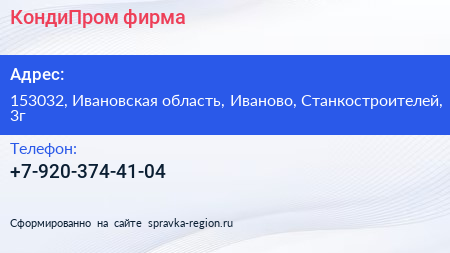 КондиПром, фирма по адресу 153032, Ивановская область, Иваново, Станкостроителей, 3г в дальнейшем Организация, размещена в следующих категориях: