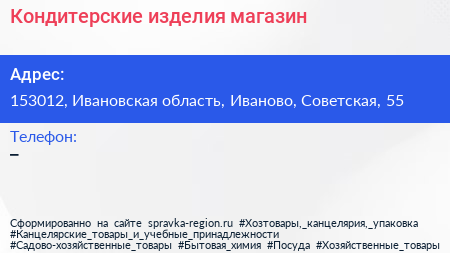 Кондитерские изделия, магазин по адресу 153012, Ивановская область, Иваново, Советская, 55 в дальнейшем Организация, размещена в следующих категориях: