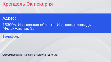 Крендель`Ок, пекарня по адресу 153006, Ивановская область, Иваново, площадь Меланжистов, 3а в дальнейшем Организация, размещена в следующих категориях: