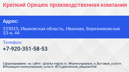 Крепкий Орешек, производственная компания по адресу 153015, Ивановская область, Иваново, Березниковская 13-я, 44 в дальнейшем Организация, размещена в следующих категориях: