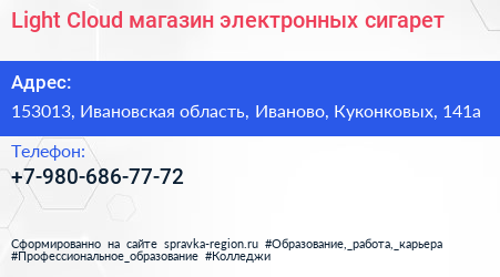 Light Cloud, магазин электронных сигарет по адресу 153013, Ивановская область, Иваново, Куконковых, 141а в дальнейшем Организация, размещена в следующих категориях: