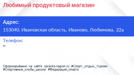 Любимый, продуктовый магазин по адресу 153040, Ивановская область, Иваново, Любимова, 22а в дальнейшем Организация, размещена в следующих категориях: