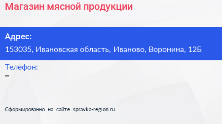 Магазин мясной продукции по адресу 153035, Ивановская область, Иваново, Воронина, 12Б в дальнейшем Организация, размещена в следующих категориях: