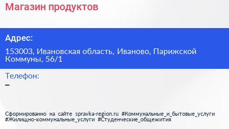 Магазин продуктов по адресу 153003, Ивановская область, Иваново, Парижской Коммуны, 56/1 в дальнейшем Организация, размещена в следующих категориях: