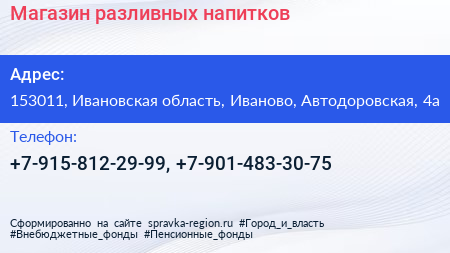 Магазин разливных напитков по адресу 153011, Ивановская область, Иваново, Автодоровская, 4а в дальнейшем Организация, размещена в следующих категориях: