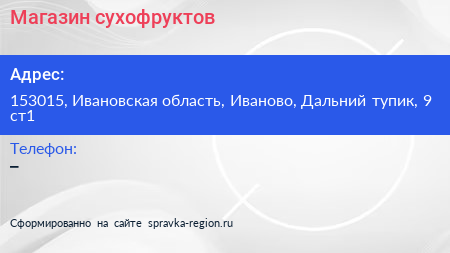 Магазин сухофруктов по адресу 153015, Ивановская область, Иваново, Дальний тупик, 9 ст1 в дальнейшем Организация, размещена в следующих категориях: