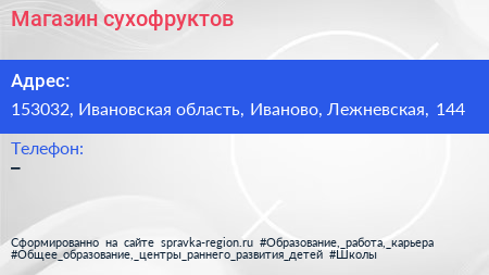 Магазин сухофруктов по адресу 153032, Ивановская область, Иваново, Лежневская, 144 в дальнейшем Организация, размещена в следующих категориях: