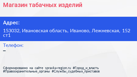 Магазин табачных изделий по адресу 153032, Ивановская область, Иваново, Лежневская, 152 ст1 в дальнейшем Организация, размещена в следующих категориях: