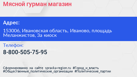 Мясной гурман, магазин по адресу 153006, Ивановская область, Иваново, площадь Меланжистов, 3а киоск в дальнейшем Организация, размещена в следующих категориях: