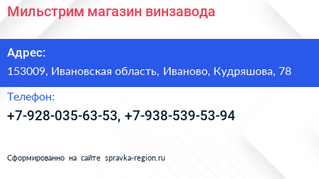 Мильстрим, магазин винзавода по адресу 153009, Ивановская область, Иваново, Кудряшова, 78 в дальнейшем Организация, размещена в следующих категориях: