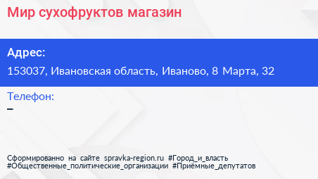 Мир сухофруктов, магазин по адресу 153037, Ивановская область, Иваново, 8 Марта, 32 в дальнейшем Организация, размещена в следующих категориях: