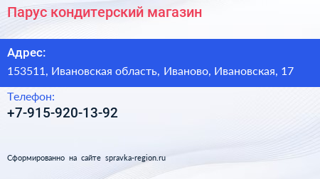 Парус, кондитерский магазин по адресу 153511, Ивановская область, Иваново, Ивановская, 17 в дальнейшем Организация, размещена в следующих категориях: