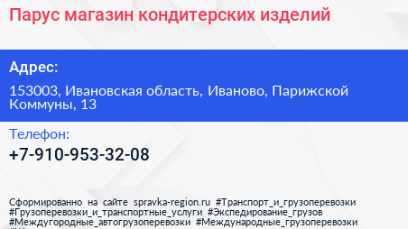 Парус, магазин кондитерских изделий по адресу 153003, Ивановская область, Иваново, Парижской Коммуны, 13 в дальнейшем Организация, размещена в следующих категориях: