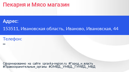 Пекарня и Мясо, магазин по адресу 153511, Ивановская область, Иваново, Ивановская, 44 в дальнейшем Организация, размещена в следующих категориях: