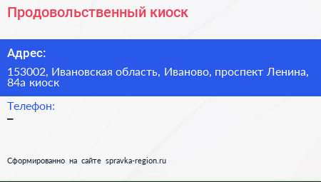 Продовольственный киоск по адресу 153002, Ивановская область, Иваново, проспект Ленина, 84а киоск в дальнейшем Организация, размещена в следующих категориях: