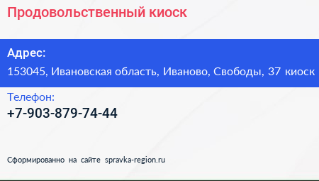 Продовольственный киоск по адресу 153045, Ивановская область, Иваново, Свободы, 37 киоск в дальнейшем Организация, размещена в следующих категориях: